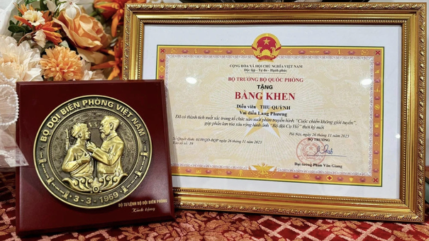 Cùng với Việt Anh, diễn viên Thu Quỳnh cũng chia sẻ bằng khen Bộ Quốc phòng trao nhờ vai diễn Lang Phương trong "Cuộc chiến không giới tuyến".