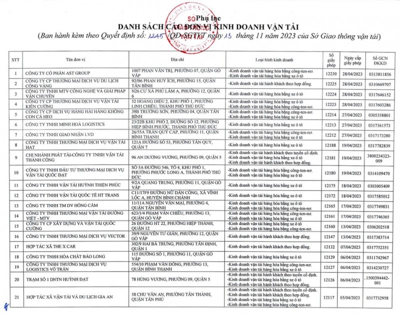 Ngoài Thành Bưởi, Sở Giao thông vận tải TP. Hồ Chí Minh cũng có quyết định thu hồi giấy phép kinh doanh vận tải bằng ô tô không thời hạn đối với 21 nhà xe khác. Quyết định có hiệu lực từ ngày ký là ngày 13/11/2023.