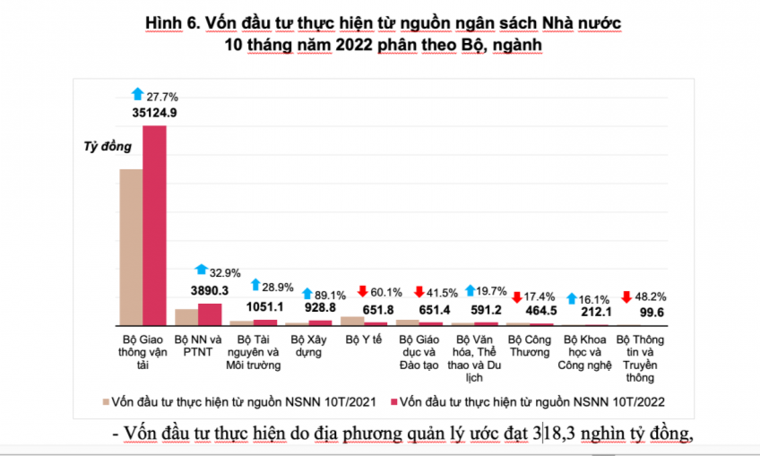 Cụ thể, vốn đầu tư thực hiện do trung ương quản lý ước đạt 69,4 nghìn tỷ đồng, bằng 62,3% kế hoạch năm và tăng 21,8% so với cùng kỳ năm trước. Những bộ có vốn đầu tư thực hiện từ nguồn ngân sách 10 tháng năm 2022 tăng mạnh là Bộ Xây dựng, tăng 89,1%; Bộ Nông nghiệp và Phát triển Nông thôn tăng 32,9%; Bộ Tài nguyên và Môi trường, tăng 28,9%; Bộ Giao thông vận tải, tăng 27,7%. Trong khi đó, Bộ Y tế; Bộ Thông tin và Truyền thông; Bộ Giáo dục và Đào tạo là những bộ có vốn đầu tư thực hiện từ nguồn ngân sách nhà nước giảm mạnh so với cùng kỳ năm 2021.