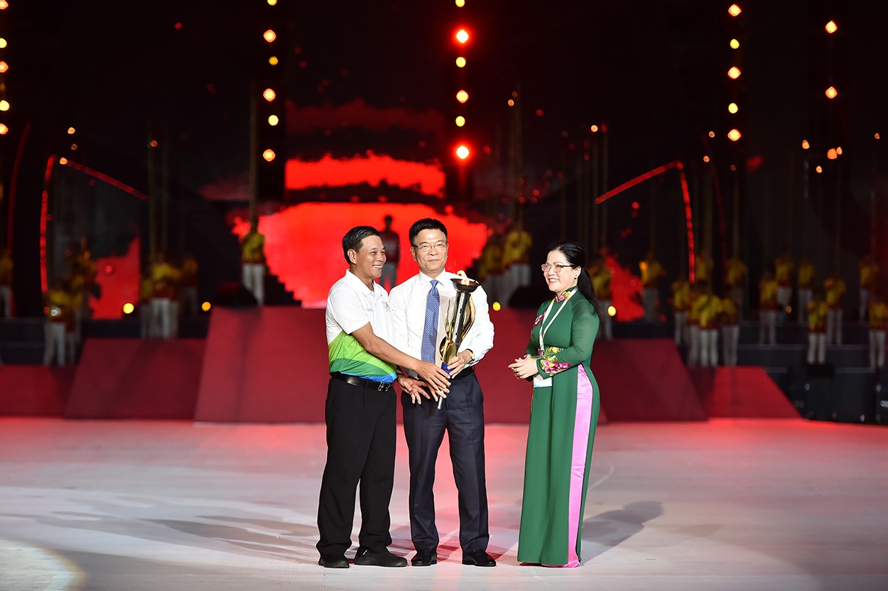 | Phó Thủ tướng Lê Thành Long và đại diện Ban Tổ chức thực hiện nghi thức đón và chuyển ngọn đuốc Hội khoẻ Phù Đổng toàn quốc lần thứ X năm 2024. Ảnh: Bộ Giáo dục và Đào tạo |