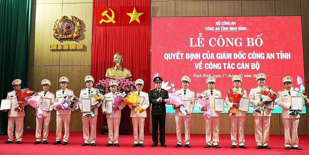 Chiều 17/2, Công an tỉnh Ninh Bình tổ chức công bố các quyết định về nghỉ công tác, hưởng chế độ hưu trí và nghỉ công tác, chờ hưởng chế độ hưu trí đối với các lãnh đạo Công an cấp phòng, lãnh đạo Công an cấp huyện.