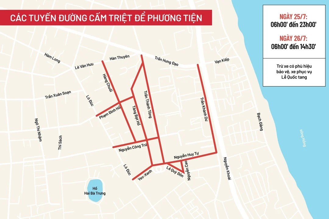 Phòng CSGT Hà Nội cho biết, để phục vụ Quốc tang Ủy viên Bộ Chính trị, Tổng Bí thư Ban Chấp hành Trung ương Đảng Cộng sản Việt Nam Nguyễn Phú Trọng, trong hai ngày 25 và 26/7, Công an TP. Hà Nội cấm tuyệt đối các phương tiện (trừ xe có phù hiệu bảo vệ, xe phục vụ Quốc tang) từ 6h đến 23h ngày 25/7 và từ 6h đến 14h30 ngày 26/7 trên các tuyến đường: Tăng Bạt Hổ, Phạm Đình Hổ (đoạn từ Lò Đúc đến Tăng Bạt Hổ), Nguyễn Công Trứ (đoạn từ Lò Đúc đến Trần Thánh Tông), Yec-Xanh, Trần Thánh Tông, Nguyễn Huy Tự, Lê Quý Đôn (đoạn từ Nguyễn Cao đến Yec-Xanh), Nguyễn Cao (đoạn từ Lê Quý Đôn đến Nguyễn Huy Tự), Hàng Chuối (đoạn từ Hàn Thuyên đến Nguyễn Công Trứ) và đường Trần Khánh Dư (đoạn từ Trần Hưng Đạo đến Lê Quý Đôn).