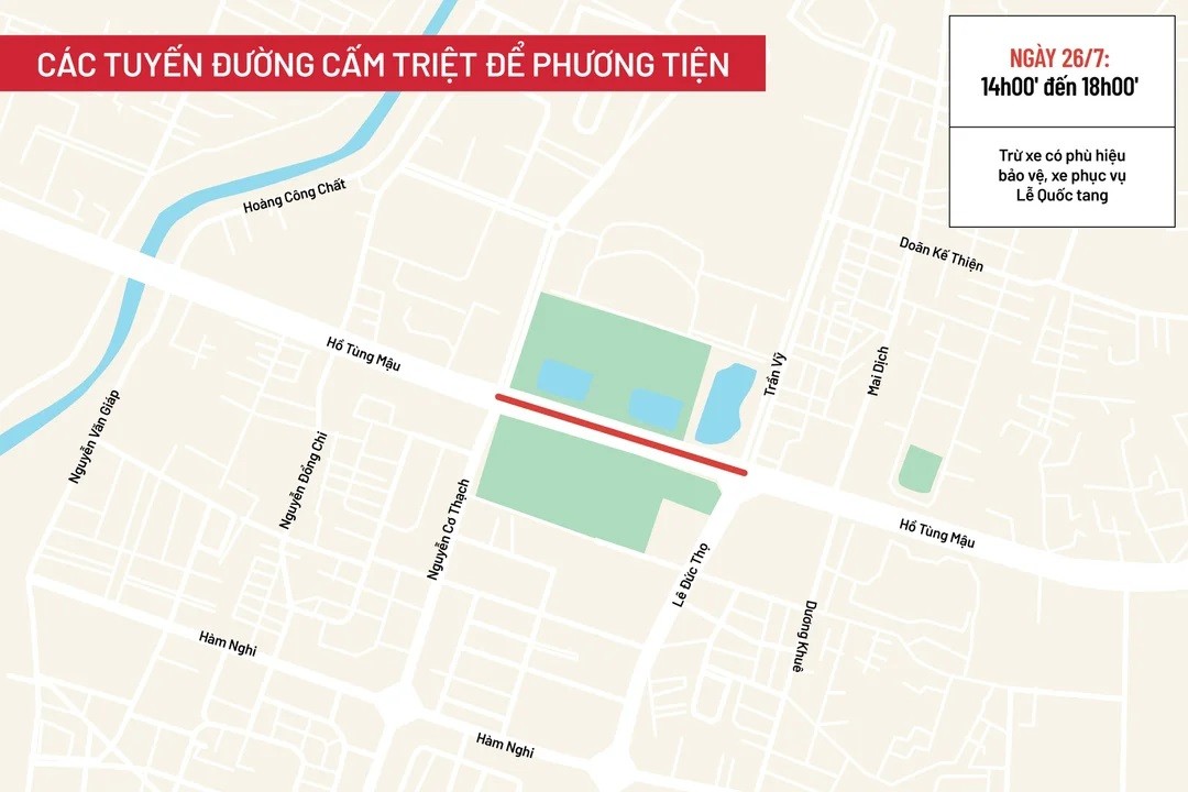 Từ 14h đến 18h ngày 26/7, cấm các phương tiện lưu thông trên tuyến Hồ Tùng Mậu (đoạn từ Lê Đức Thọ đến Nguyễn Cơ Thạch).