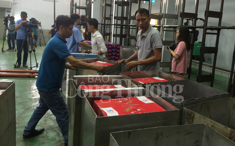 Chia sẻ về quy trình chiếu xạ cho vải, ông Đặng Quang Thiệu - Giám đốc Trung tâm chiếu xạ Hà Nội - cho biết: Tất cả các lô vải chuẩn bị xuất khẩu được tập kết ở một kho riêng, sau đó kiểm dịch thực vật lấy ngẫu nhiên một vài thùng hàng và tiến hành kiểm dịch. Nếu đạt chất lượng kiểm dịch về cảm quan, thì các lô hàng này sẽ được mang vào phòng chiếu xạ. Sau khi chiếu xạ xong, toàn bộ lô hàng này sẽ đưa sang kho lạnh thứ 2. 2 kho này phải cách biệt nhau và được cách li để chống côn trùng thâm nhập. Từ kho lạnh này sẽ được nhân viên đóng vào container, đưa ra sân bay và vận chuyển bằng đường hàng không sang Úc.