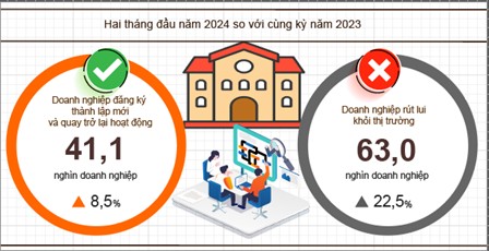 | Hai tháng đầu năm 2024 số doanh nghiệp thành lập mới và quay trở lại hoạt động tăng 8,5% so với cùng kỳ năm 2023 |