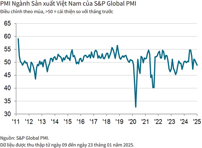 Chỉ số PMI ngành sản xuất Việt Nam đạt kết quả 48,9 điểm trong tháng 1/2025, giảm so với 49,8 điểm của tháng 12/2024 và nằm dưới ngưỡng 50 điểm tháng thứ hai liên tiếp. Mức suy giảm của các điều kiện hoạt động là vừa phải, nhưng đáng kể hơn một chút so với kỳ khảo sát trước.