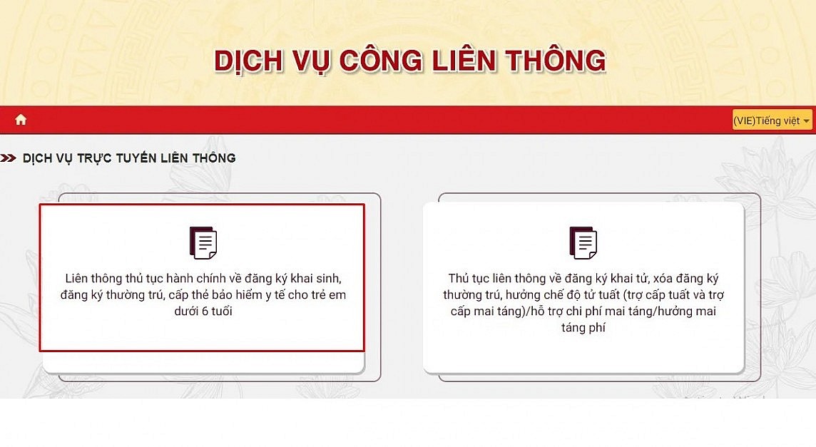 Bước 1: Người yêu cầu truy cập vào cổng Dịch vụ công quốc gia (tại địa chỉ dichvucong.gov.vn) hoặc trên ứng dụng VNelD, lựa chọn mục "Dịch vụ công liên thông khai sinh, khai tử" để thực hiện nộp hồ sơ trực tuyến và lệ phí theo quy định.
