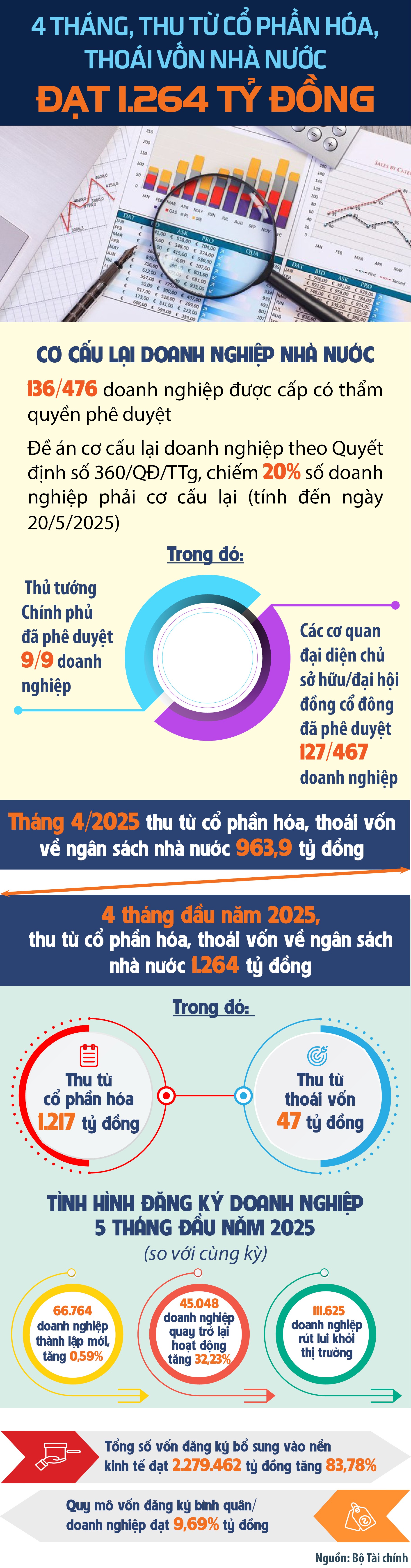 Theo Bộ Tài chính, lũy kế 4 tháng đầu năm 2025, số thu từ cổ phần hóa,thoái vốn nhà nước về ngân sách nhà nước là 1.264 tỷ đồng. Trong đó số thu từ cổ phần hóa là 1.217 tỷ đồng và số thu từ thoái vốn là 47 tỷ đồng.