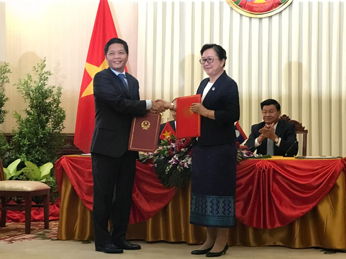 | Bộ trưởng Bộ Công Thương Trần Tuấn Anh và Bộ trưởng Bộ Công Thương Lào Khemmani Pholsena ký kết văn kiện hợp tác (tháng 4/2017) |