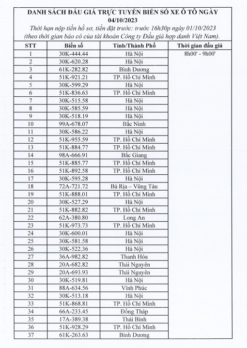 Dưới đây là danh sách biển số ô tô và các phiên đấu giá trực tuyến ngày 4/10: