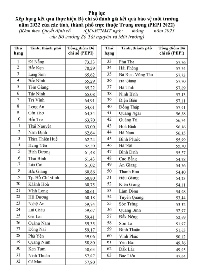 Bộ Tài nguyên và Môi trường đã ban hành Quyết định số 4161/QĐ-BTNMT phê duyệt và công bố kết quả thực hiện Bộ chỉ số đánh giá kết quả bảo vệ môi trường năm 2022 của các tỉnh, thành phố trực thuộc Trung ương (PEPI 2022).