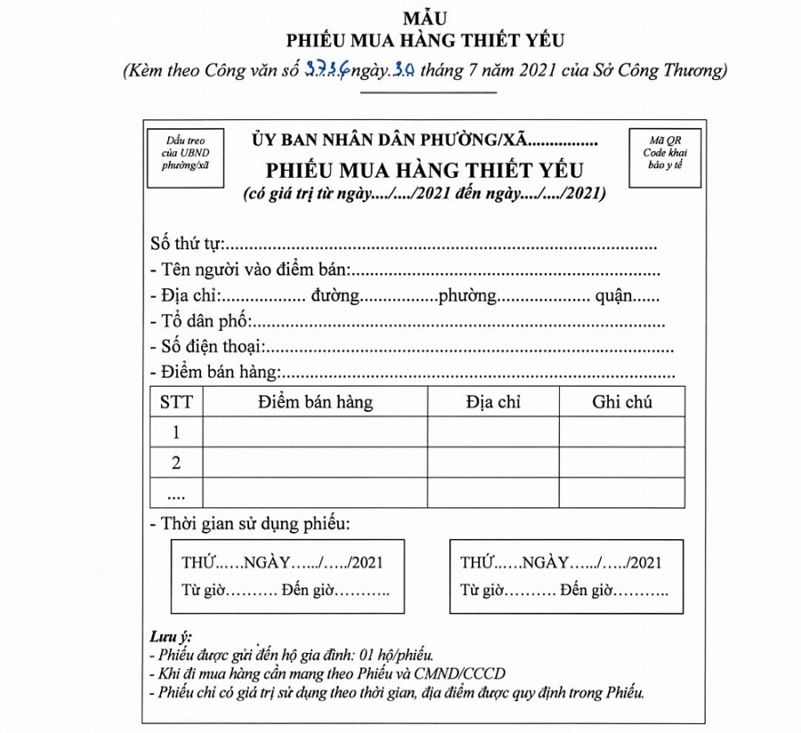 Sở Công Thương cũng lưu ý các địa phương phải nghiên cứu tích hợp mã QR code trên “Phiếu mua hàng thiết yếu”, để phục vụ khai báo y tế người ra vào điểm bán. Đặc biệt, “Phiếu mua hàng thiết yếu” cần thực hiện đầy đủ họ và tên, địa chỉ, số điện thoại, chứng minh nhân dân hoặc căn cước công dân. Mỗi hộ dân chỉ cử 1 người đại diện mua hàng hóa thiết yếu tại các điểm bán, theo khung thời gian phù hợp (ghi rõ thời gian đi và địa điểm bán hàng gần nhất) để người dân tiệm mua sắm…