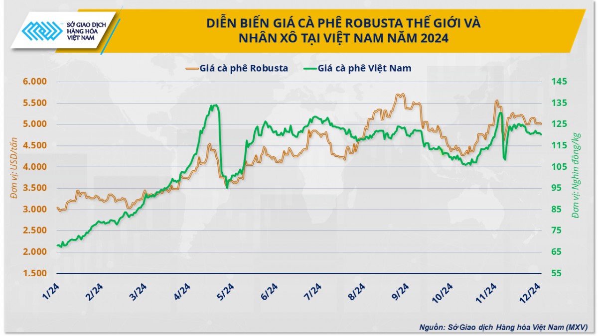 | Diễn biến giá cà phê Robusta thế giới và nhân xô Việt Nam năm 2024 |