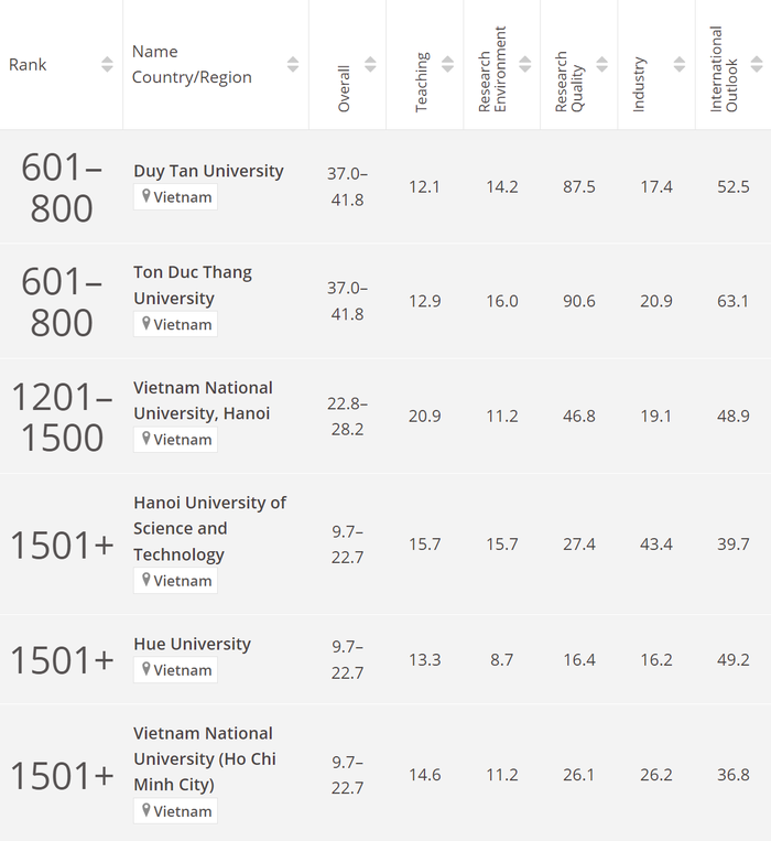 Trong bảng xếp hạng năm nay, Việt Nam vẫn chỉ có 6 cơ sở giáo dục đại học được xếp hạng chính thức, gồm: trường Đại học Duy Tân, trường Đại học Tôn Đức Thắng, Đại học Quốc gia Hà Nội, Đại học Quốc gia TP. Hồ Chí Minh, Đại học Bách khoa Hà Nội, Đại học Huế.