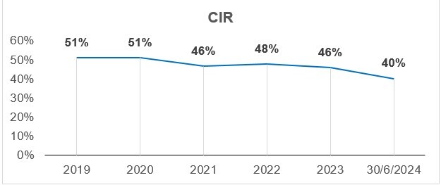 Tỷ lệ chi phí/tổng thu nhập hoạt động (CIR) tại NAB trong quý 2/2024 đã có sự cải thiện hiệu quả, CIR quý 2 về sát mốc 40% - mức thấp nhất trong 5 năm gần đây.