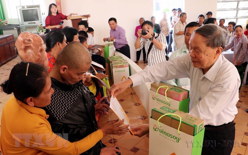 | Thượng tướng Nguyễn Văn Rinh, Chủ tịch Hội nạn nhân chất độc da cam/dioxin Việt Nam tặng quà nạn nhân da cam tỉnh Sóc Trăng năm 2019. |