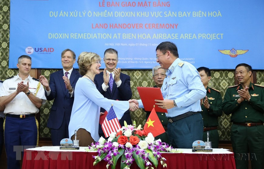 | Thiếu tướng Bùi Anh Chung, Phó Tư lệnh Quân chủng Phòng không- Không quân và bà Bonnie Glick, Phó Tổng Giám đốc toàn cầu Cơ quan Phát triển quốc tế Hoa Kỳ ký kết bàn giao mặt bằng Dự án xử lý ô nhiễm dioxin khu vực sân bay Biên Hòa ngày 1/11/2019. |