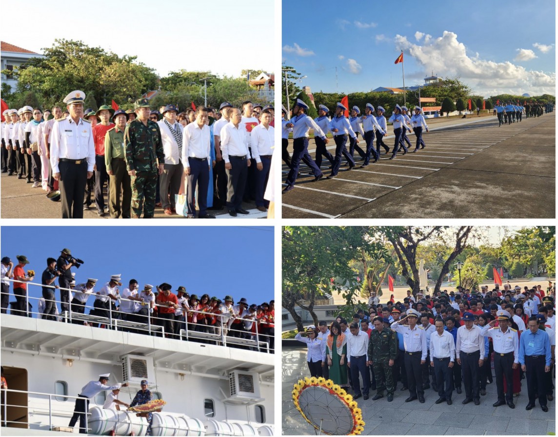 | Từ trái qua phải từ trên xuống dưới, ảnh: Đoàn công tác số 15 thực hiện nghi Lễ chào cờ, diễu binh tại đảo Trường Sa lớn, Lễ tưởng niệm các anh hùng liệt sĩ đã hy sinh tại Quần đảo Trường Sa và dâng hương tưởng niệm các Anh hùng liệt sĩ trên đảo Trường Sa lớn |