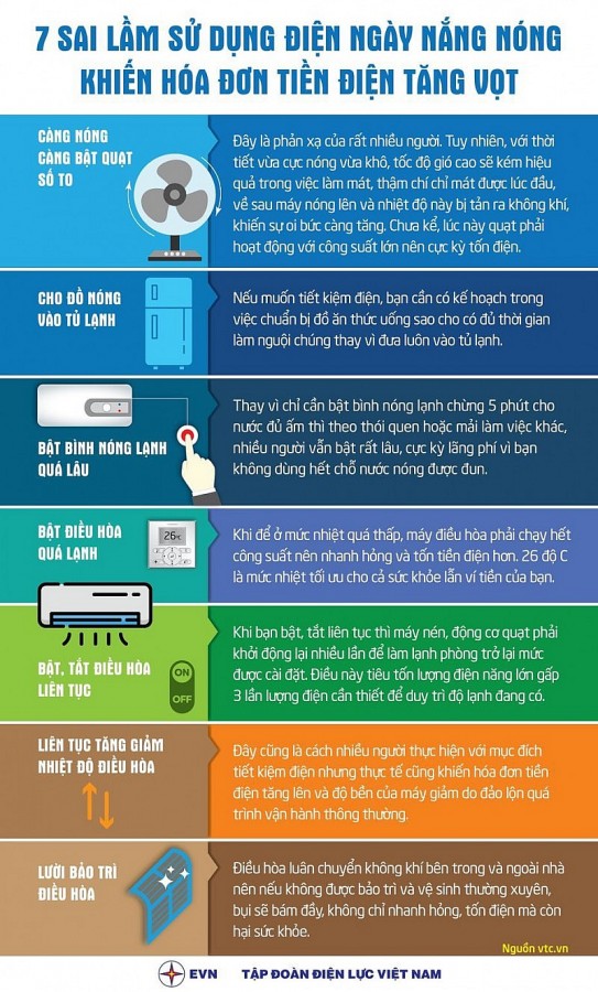 Dưới đây là 7 sai lầm sử dụng điện trong mùa nắng nóng giúp người tiêu dùng tránh được hoá đơn tiền điện tăng vọt.