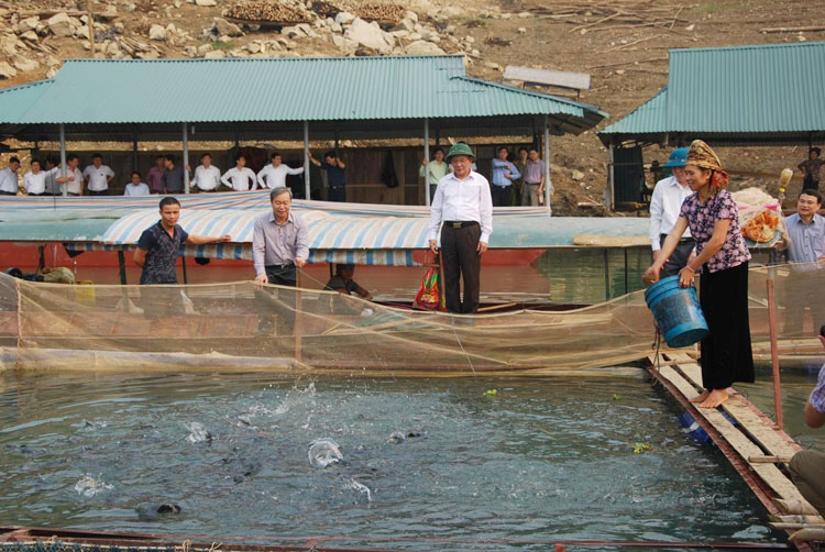 | Bí thư Tỉnh ủy Sơn La Hoàng Văn Chất (áo trắng đứng giữa) thăm mô hình nuôi cá lồng của gia đình ông Lò Văn Khăn bản Co Trặm, xã Chiềng Bằng |