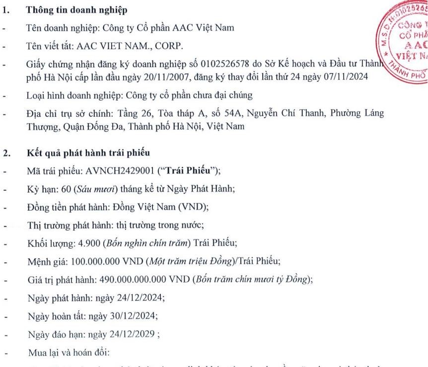 Công ty CP ACC Việt Nam (AAC Viet Nam Corporation; Mã số thuế: 0102526578) vừa gửi Văn bản số 0301/2025/TB-AAC ngày 3/1/2025 gửi Sở Giao dịch Chứng khoán Hà Nội (HNX) về công bố kết quả chào bán lô trái phiếu riêng lẻ AVNCH2429001.