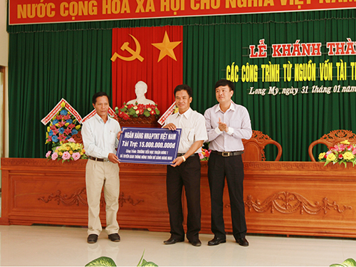 Agribank là một trong 04 đơn vị đã tham gia tài trợ 02 công trình trên địa bàn tỉnh Hậu Giang: Xây dựng trường tiểu học Thuận Hưng 1, trường học đạt tiêu chuẩn quốc gia với quy mô 10 phòng học, đảm bảo diện tích học cho 700 học sinh/ngày và tuyến giao thông nông thôn Bờ Xáng Nàng Mau quy mô đường nhựa 3,5m, dài 5500m tại huyện Long Mỹ, tỉnh Hậu Giang với tổng kinh phí tài trợ 15 tỷ đồng.