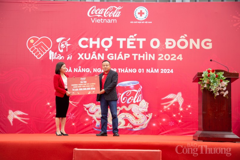 | Đại diện Coca-Cola Việt Nam trao tài trợ chương trình Chợ Tết 0 đồng xuân Giáp Thìn 2024. |