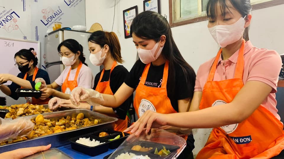 | Các thành viên Câu lạc bộ "Cơm 5000 Hà Nội" đóng gói thức ăn sau chế biến... |