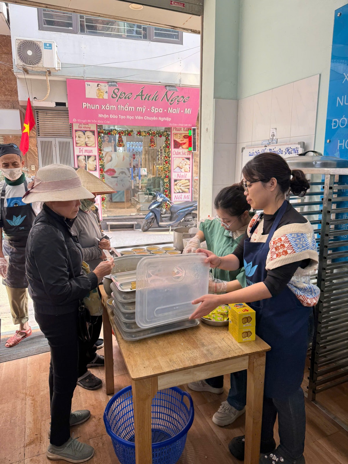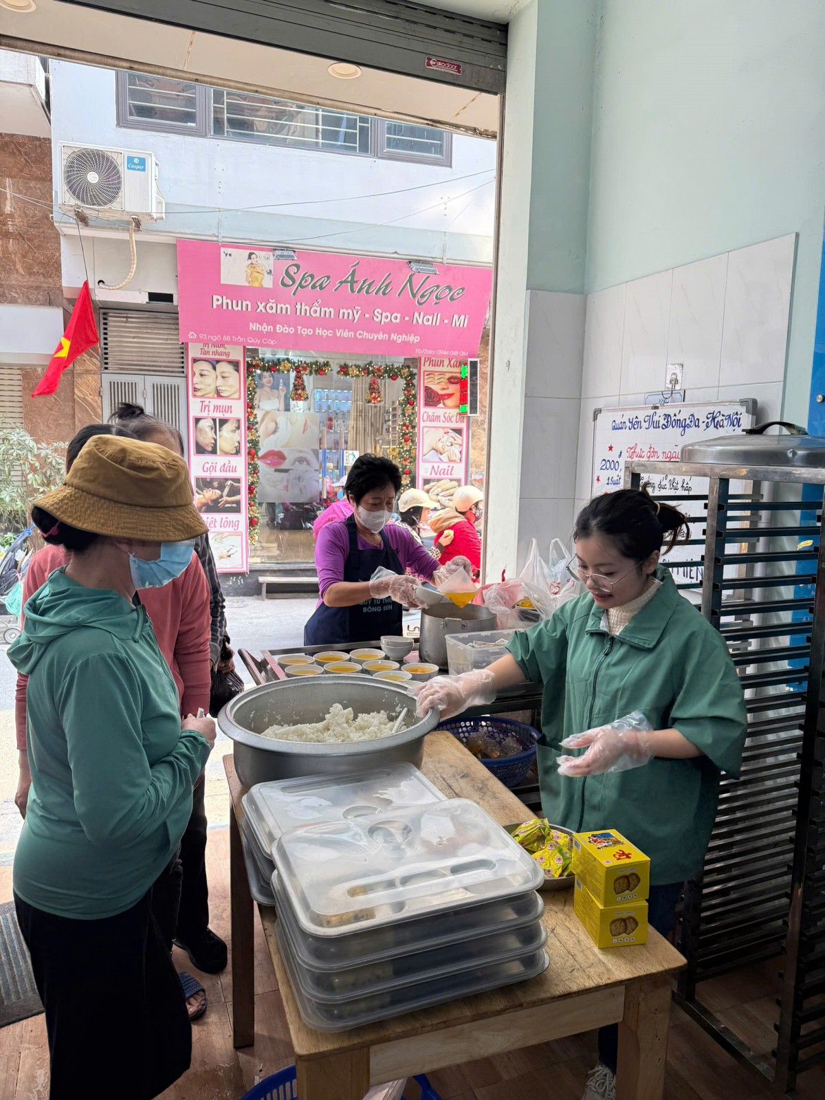 | Chị Trần Thị Xuân và các bạn nhân viên của quán chuẩn bị suất ăn cho khách. (Ảnh: Huyền Trang) |