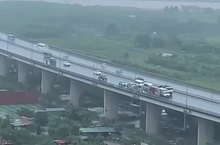 Khoảng 13h chiều 7/9, anh Minh Trí - cư dân khu chung cư Intracom Riverside (Vĩnh Ngọc, Đông Anh, Hà Nội) chứng kiến và ghi lại hình ảnh nhiều xe container, xe tải, xe taxi giảm tốc độ, đi chậm lại để che chắn gió cho xe máy đi qua cầu Nhật Tân.