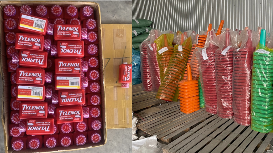 | Hộp thuốc Tylenol Acetaminophen Extra Strength, loại 500mg, xuất xứ Ấn Độ và hơn 20.000 sản phẩm phụ kiện quạt điện không nhãn hàng hóa, không rõ xuất xứ - (Ảnh: Đội QLTT số 1). |