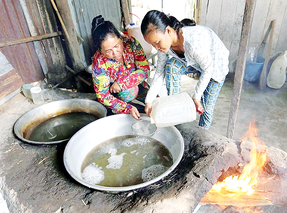 Giữa trưa, len lỏi vào các tuyến đường ở phum, sóc sẽ thấy khói phảng phất trên những mái nhà, ngửi được hương thơm ngào ngạt. Đây là các điểm nấu đường thốt nốt được người dân chế biến đường thốt nốt thô. Nếu công việc lấy nước thốt nốt chỉ dành cho đàn ông thì nấu đường là công việc dành riêng cho phụ nữ. Chị Néang Hiếp ở ấp Tà On (xã Châu Lăng, huyện Tri Tôn) cho biết, nước thốt nốt được nấu khoảng hơn 4 giờ là cô đặc lại thành đường dạng lỏng. Sau khi cô đặc đạt yêu cầu, chảo được nhắc ra khỏi lò, khuấy liên tục để còn màu vàng tươi đặc trưng của đường. Bình quân khoảng 8 - 10 lít nước thốt nốt sẽ thu về 1kg đường. Sản phẩm thu được sẽ đem bán cho các cơ sở kinh doanh trên huyện để đóng hũ hay nấu đường viên. “Hiện nhà chị đang sở hữu 20 cây thốt nốt, bình quân mỗi ngày chị nấu được 20kg đường, bán cho các cơ sở với giá 25.000 đồng/kg, mỗi ngày, gia đình chị thu về khoảng 500.000 đồng” - chị Néang Hiếp chia sẻ.