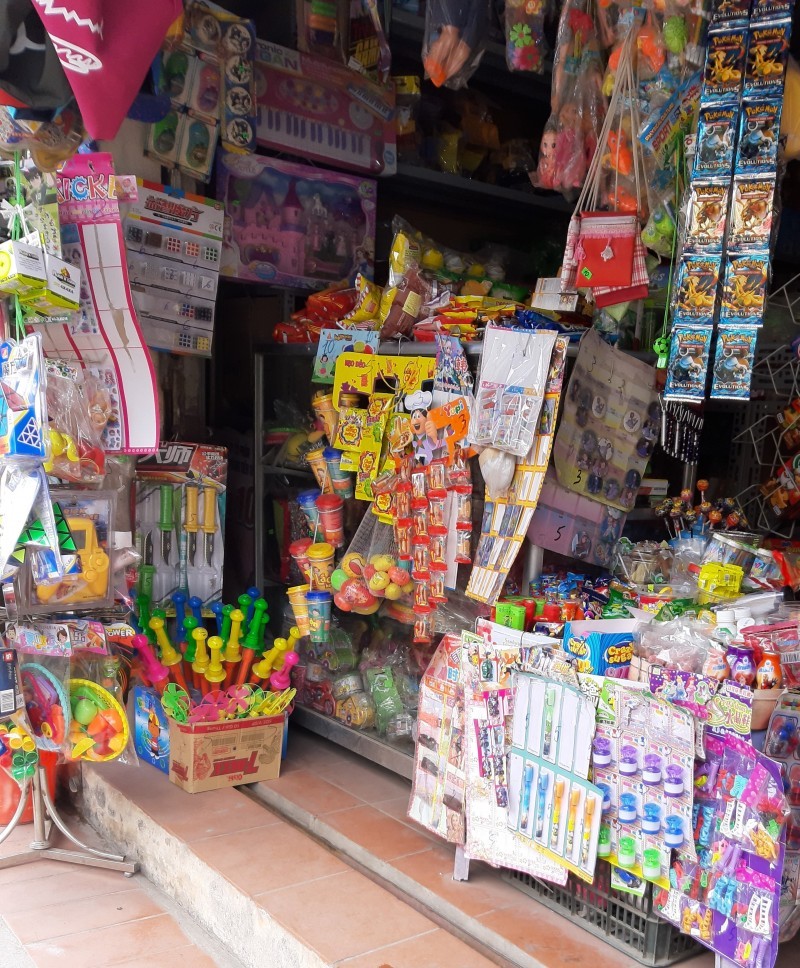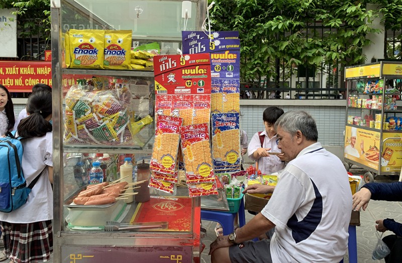 Các loại khô gà cay, que cay, thạch, ô mai, kẹo dẻo, kẹo nổ (nổ lụp bụp trong miệng khi ăn), mì vụn (mì gói bóp vụn cho vào từng gói nhỏ) với giá 1.000 đồng - 5.000 đồng/gói. Hầu hết các loại bánh kẹo này đều có bao bì toàn chữ Trung Quốc, không có nhãn phụ tiếng Việt cũng như ngày sản xuất, hạn sử dụng.