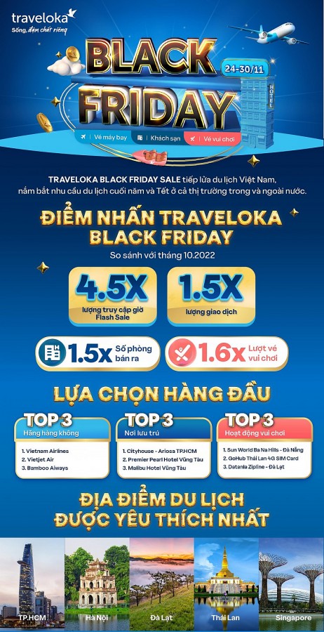 Chương trình Black Friday - Siêu Sale Du lịch 2022 diễn ra từ ngày 24/11 tới 30/11, Traveloka triển khai thành công chương trình Black Friday và đã ghi nhận tổng lượng đặt phòng tăng mạnh gấp 5 lần so với cùng kỳ năm ngoái. Thu hút khoảng 1,300 đối tác trong ngành du lịch, chương trình là một minh chứng cho cam kết lâu dài của nền tảng đối với chuyển đổi số và phục hồi ngành du lịch Việt Nam. Trong chương trình, Traveloka đã cung cấp hàng nghìn khuyến mãi hấp dẫn lên đến 50% cho các sản phẩm vé máy bay, khách sạn, vé vui chơi và tour, nhằm nâng cao trải nghiệm công nghệ hóa của khách hàng. Ngoài ra, chương trình còn mang đến thông điệp nhấn mạnh mục tiêu của Traveloka là khơi dậy du lịch Việt Nam trong thời đại 4.0 bằng việc cung cấp trải nghiệm du lịch tốt nhất trên nền tảng kỹ thuật số.