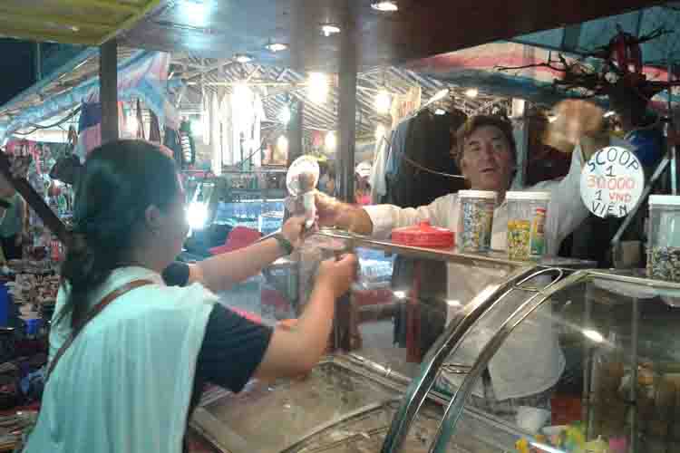Cũng giống như trường hợp của Van Bakel, anh Lucky (quốc tịch Pháp) ở Phú Quốc được hơn 2 năm. Bằng tiếng Việt lơ lớ, anh vui vẻ chia sẻ: “Bà xã tôi người Rạch Giá (Kiên Giang) chính gốc. Hai vợ chồng bán kem tại chợ đêm Dinh Cậu được hơn 1 năm”. Trong lúc trò chuyện với anh, chúng tôi nhận thấy phần lớn khách hàng là người Việt Nam, có lẽ mua vì tò mò, vì muốn nói dăm ba câu chuyện với ông bán hàng tiếng Việt lơ lớ, dù kem khá đắt so với mặt bằng chung: 30.000 đồng/viên.