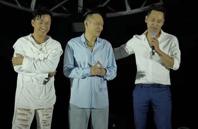 | MC Phan Anh (ngoài cùng bên phải) được cho là kém duyên khi xuất hiện trong đêm nhạc “Anh em kết đoàn" của Tuấn Hưng và Duy Mạnh tối 21/9 (Ảnh chụp màn hình) |