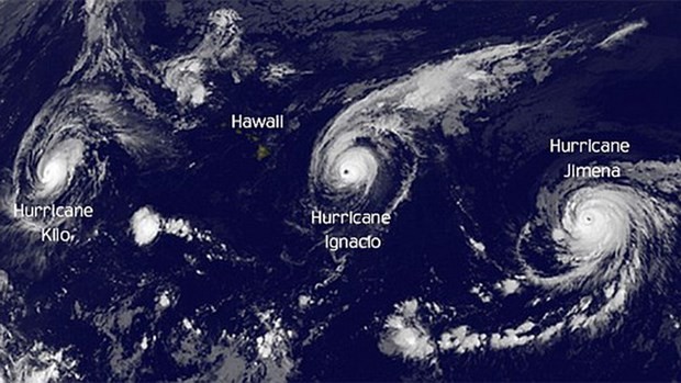 Lần đầu tiên chụp được hình ảnh 3 cơn bão hoành hành cùng một lúc. Các nhà khí tượng cho biết sự xuất hiện của các cơn bão nhiều khả năng là do cường độ mạnh bất thường của hiện tượng El Nino trong năm nay. |