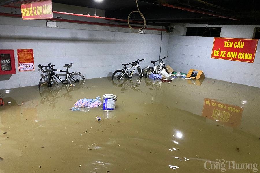 | Tại một chung cư trên địa bàn phường Khuê Mỹ (quận Ngũ Hành Sơn), khu vực hầm xe đã ngập nước cao khoảng 300mm. |