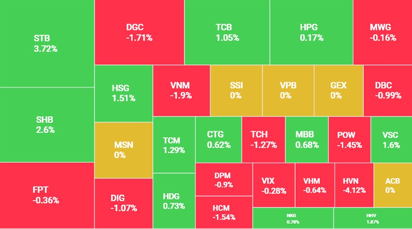 Xét về nhóm ngành, nhóm cổ phiếu ngân hàng giao dịch tích cực hơn cả khi đóng cửa tăng. Ngoài các mã ACB, BID, CTG, HDB, MBB, SHB, SSB, STB, TCB, TPB, VCB, VPB, VIB trong nhóm VN30 đã kể trên, các mã còn lại, EIB dừng ở tham chiếu, LPB tăng 1,36%, MSB tăng 0,68%, OCB giảm 0,97%.
