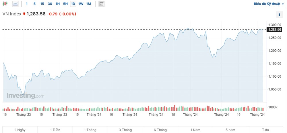| VN-Index giảm 0,79 điểm, tương đương 0,06% điểm xuống còn 1.283,56 điểm |