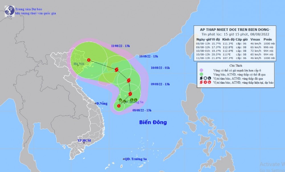 Chiều nay (8/8) vùng áp thấp trên khu vực Bắc Biển Đông mạnh lên thành áp thấp nhiệt đới. Đêm nay, áp thấp nhiệt đới có khả năng mạnh lên thành bão.