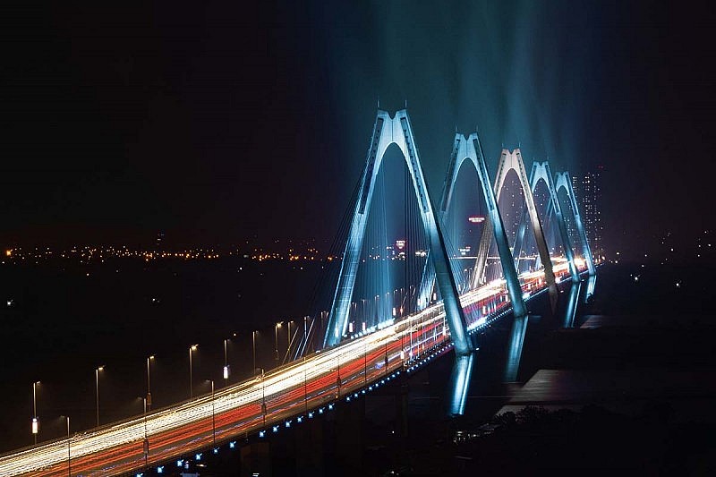 | Cầu Nhật Tân, Hà Nội được thắp sáng với màu Quốc kỳ Argentina |