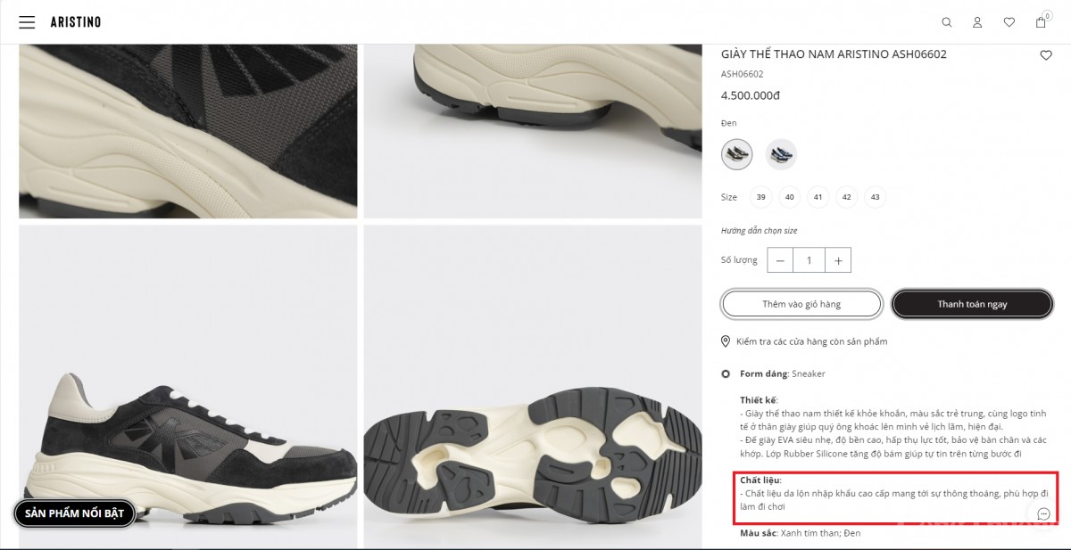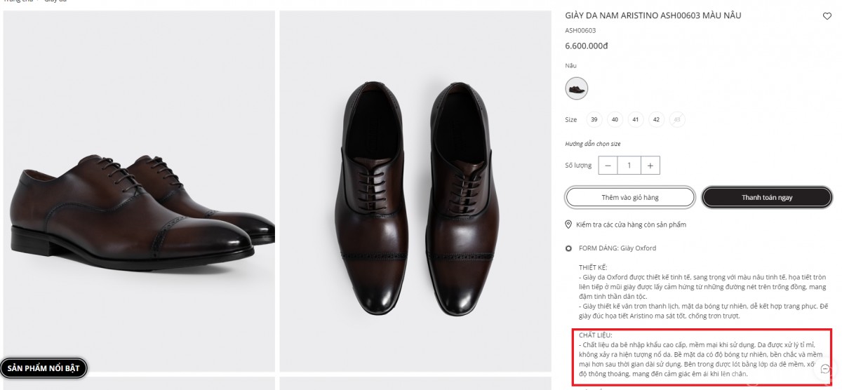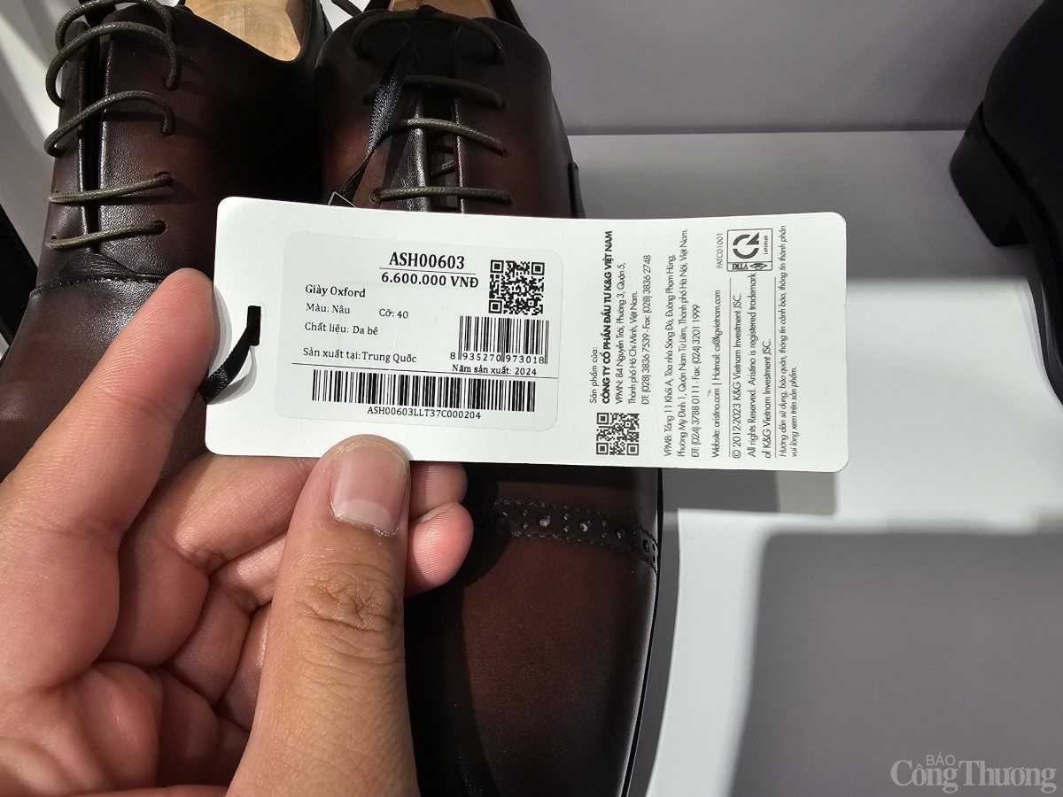 Đơn cử, sản phẩm Giày Oxford mã ASH00603 có giá 6,6 triệu đồng, tem nhãn thể hiện “Sản xuất tại: Trung Quốc”. Trong khi đó, trên trang web của Aristino, công ty không giới thiệu nơi sản xuất, mà lại giới thiệu chất liệu da bê nhập khẩu cao cấp…