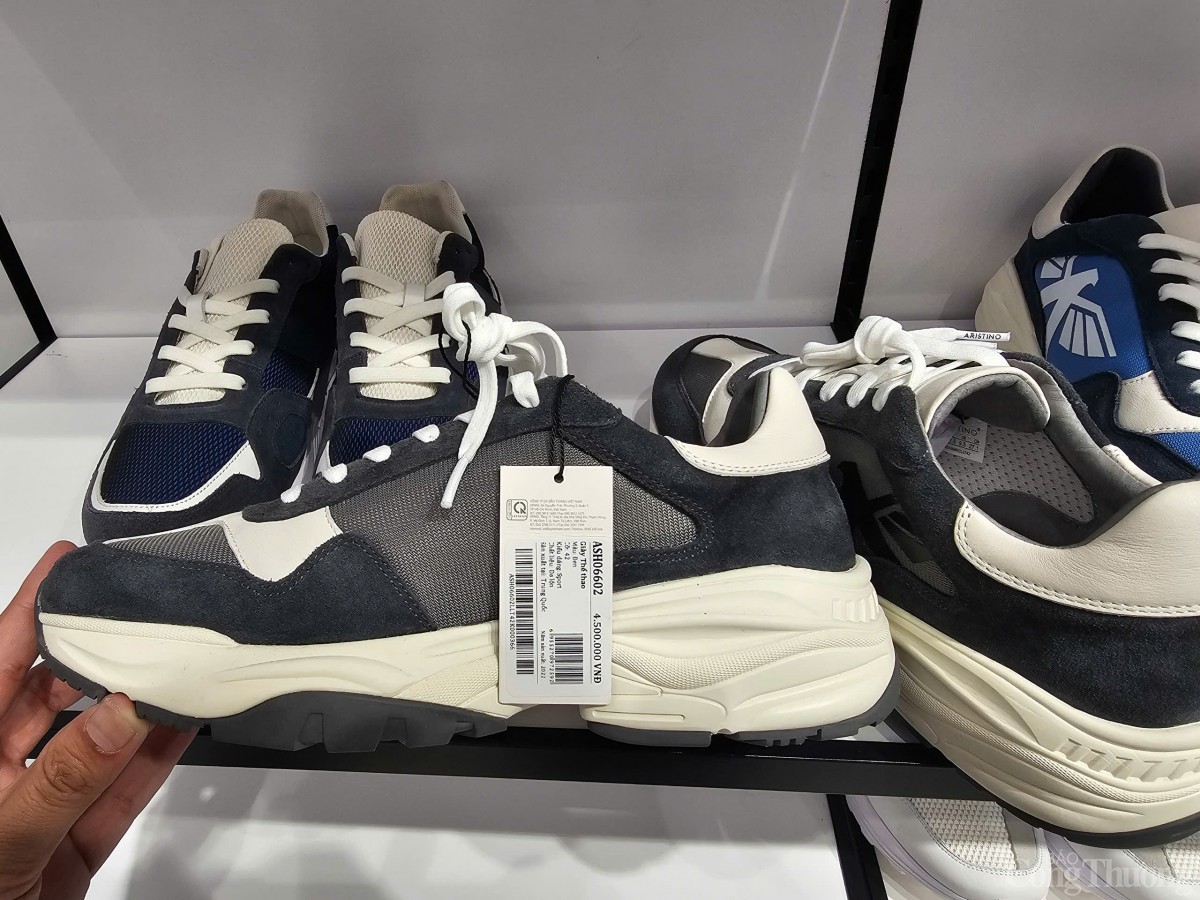 Một sản phẩm khác là Giày thể thao mã ASH06602, giá 4,5 triệu đồng, tem nhãn cũng chỉ thể hiện “Sản xuất tại: Trung Quốc”. Còn trên web giới thiệu là chất liệu da lộn nhập khẩu cao cấp…
