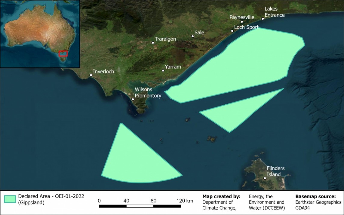 | Sơ đồ vùng điện gió ngoài khơi bang Victoria, Australia. (Ảnh: Văn phòng Bộ trưởng Biến đối khí hậu và năng lượng Chris Bowen) |