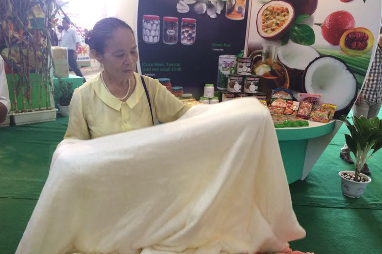 | Nghệ nhân Phan Thị Thuận mang các sản phẩm tơ tằm tự dệt và cả những người thợ của mình tham dự các hội chợ để quảng bá sản phẩm đến bạn bè trong nước và quốc tế |