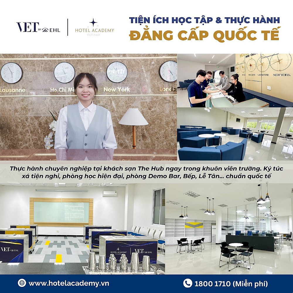 Hotel Academy Việt Nam còn đầu tư mạnh mẽ vào cơ sở vật chất hiện đại, không gian học tập tiện nghi và đội ngũ giảng viên đạt chuẩn VET by EHL, giúp học viên được theo sát từ cấp độ sơ cấp đến cao cấp. Điều này tạo nên một nền tảng vững chắc cho hành trình phát triển sự nghiệp lâu dài trong lĩnh vực khách sạn.