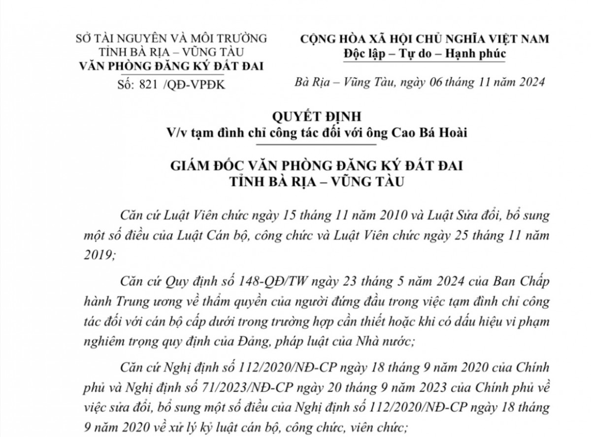 Sau khi nhận được thông báo từ Cơ quan Cảnh sát điều tra, ngày 6/11, Văn phòng đăng ký đất đai - Sở Tài nguyên và Môi trường tỉnh Bà Rịa - Vũng Tàu cũng đã ra quyết định tạm đình chỉ công tác đối với ông Cao Bá Hoài cho đến khi có kết luận của cơ quan tiến hành tố tụng.