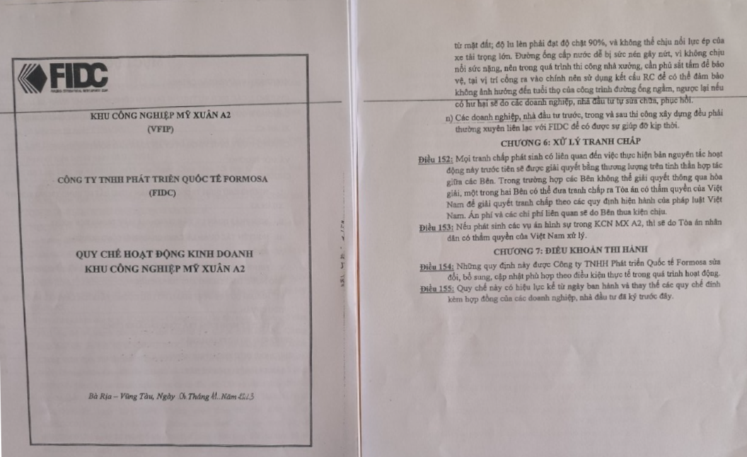 Theo đó, 19 doanh nghiệp đang sản xuất kinh doanh trong Khu công nghiệp Mỹ Xuân A2 (phường Mỹ Xuân, thị xã Phú Mỹ, tỉnh Bà Rịa - Vũng Tàu) đã đồng loạt viết đơn phản ánh về việc Công ty TNHH Phát triển quốc tế Formosa (FIDC) là Chủ đầu tư của Khu công nghiệp (KCN) Mỹ Xuân A2 đã áp đặt một số quy định bất hợp lý mà không thông qua thảo luận, lấy ý kiến của doanh nghiệp gây ra nhiều bức xúc.