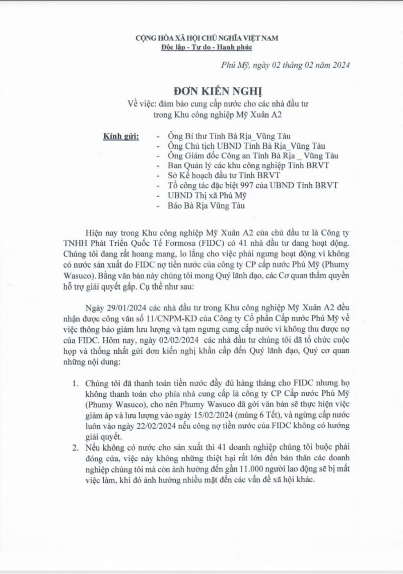 Ngày 2/2/2024, trước thông tin sẽ bị cắt nước trong thời gian tới, đại diện 19 doanh nghiệp trong Khu công nghiệp Mỹ Xuân A2 tiếp tục có đơn kiến nghị khẩn cấp đến các cơ quan chức năng tỉnh Bà Rịa – Vũng Tàu.